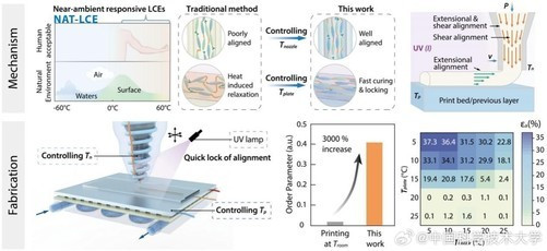 研究团队提出了一种复合冷场3D打印技术,成功制备出一种对近环境温度响应灵敏的液晶弹性体(NAT-LCEs)。这种材料不仅具备高取向序参数,还拥有多种变形能力。基于这一创新成果,团队进一步开发了一款智能腕带系统,显著提升了心率监测的精确度。